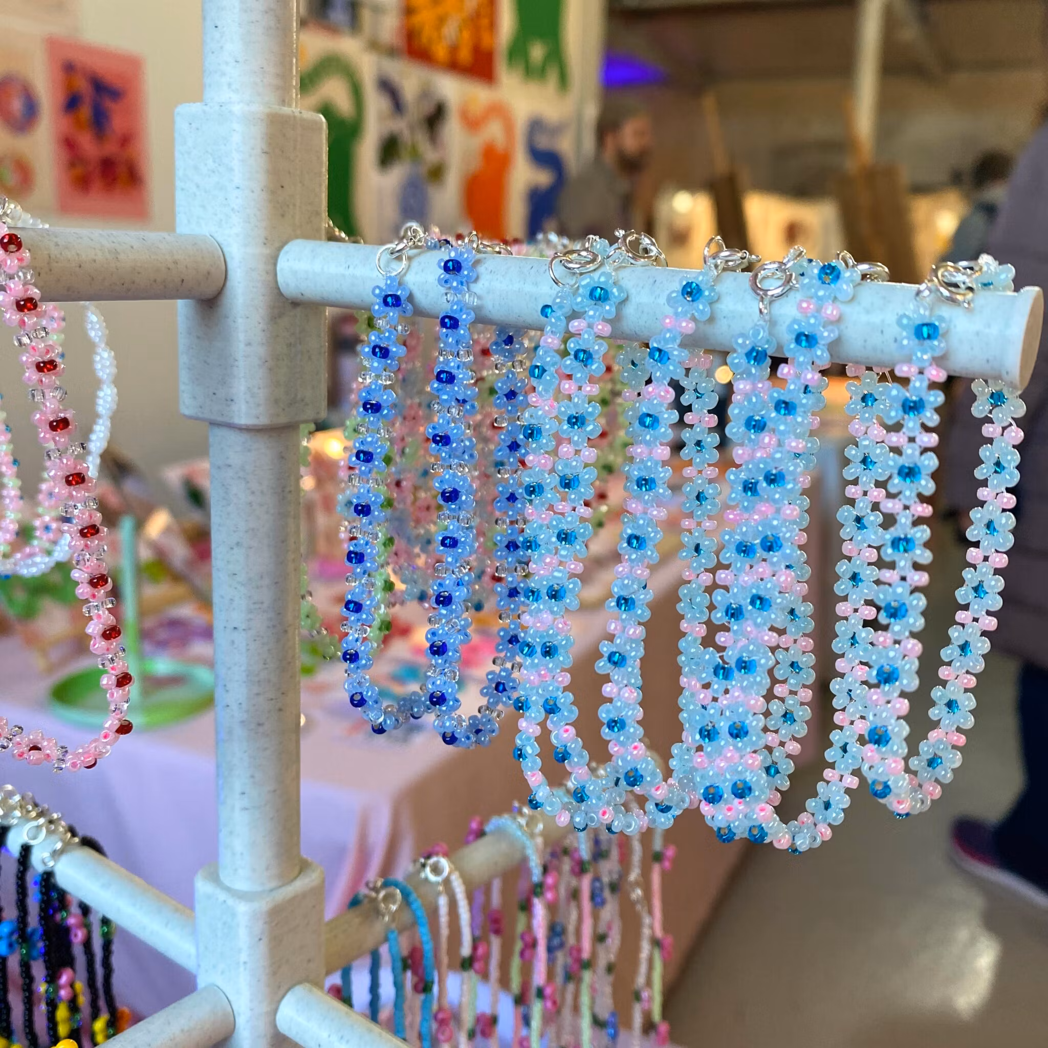 Armband med blommor i ljusblå och rosa sockervaddstoner!