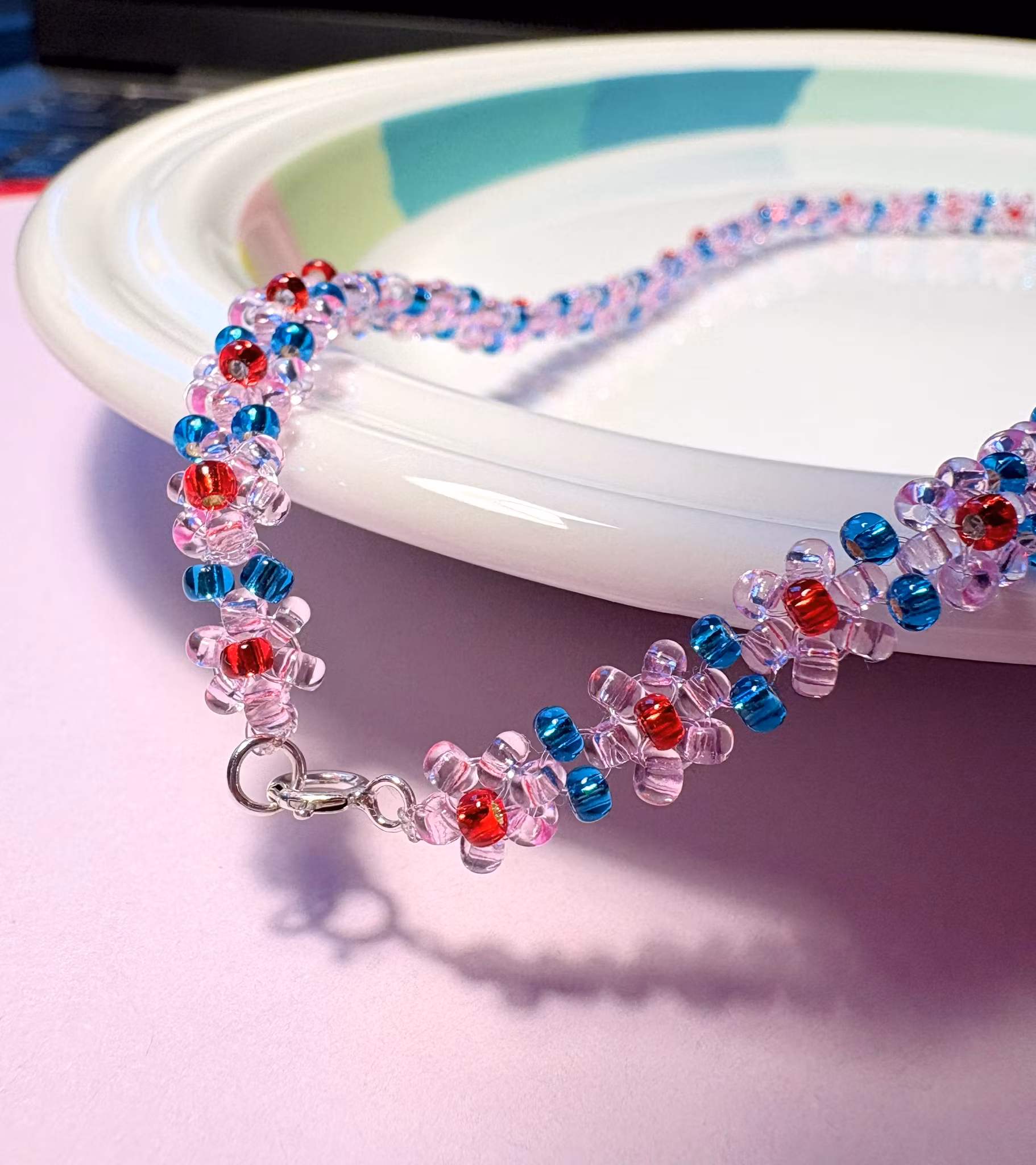 Handgjort chokerhalsband med små blommor i pastelliga toner i rosa, rött och blått! Tillverkad med tjeckiska glaspärlor och ett lås i sterlingsilver.