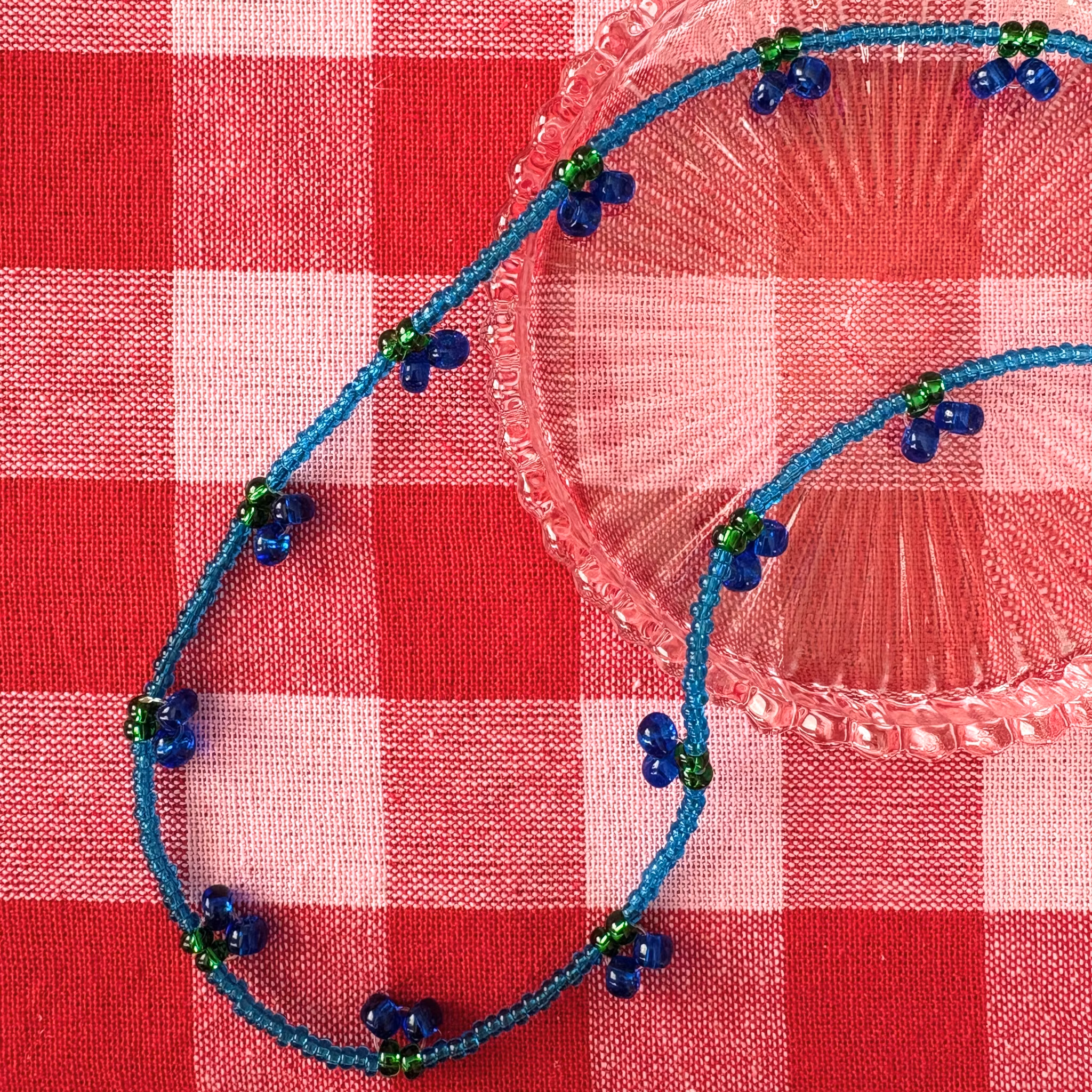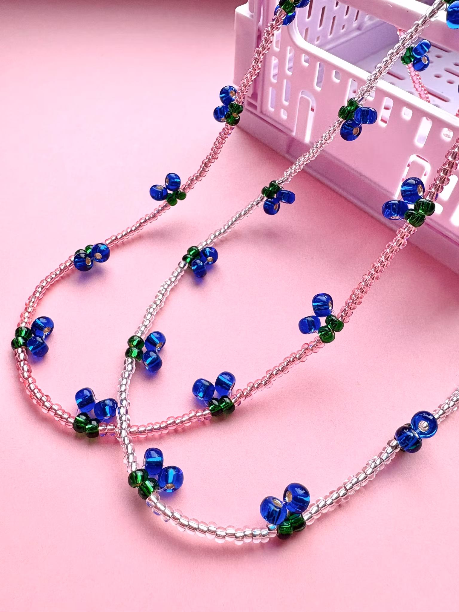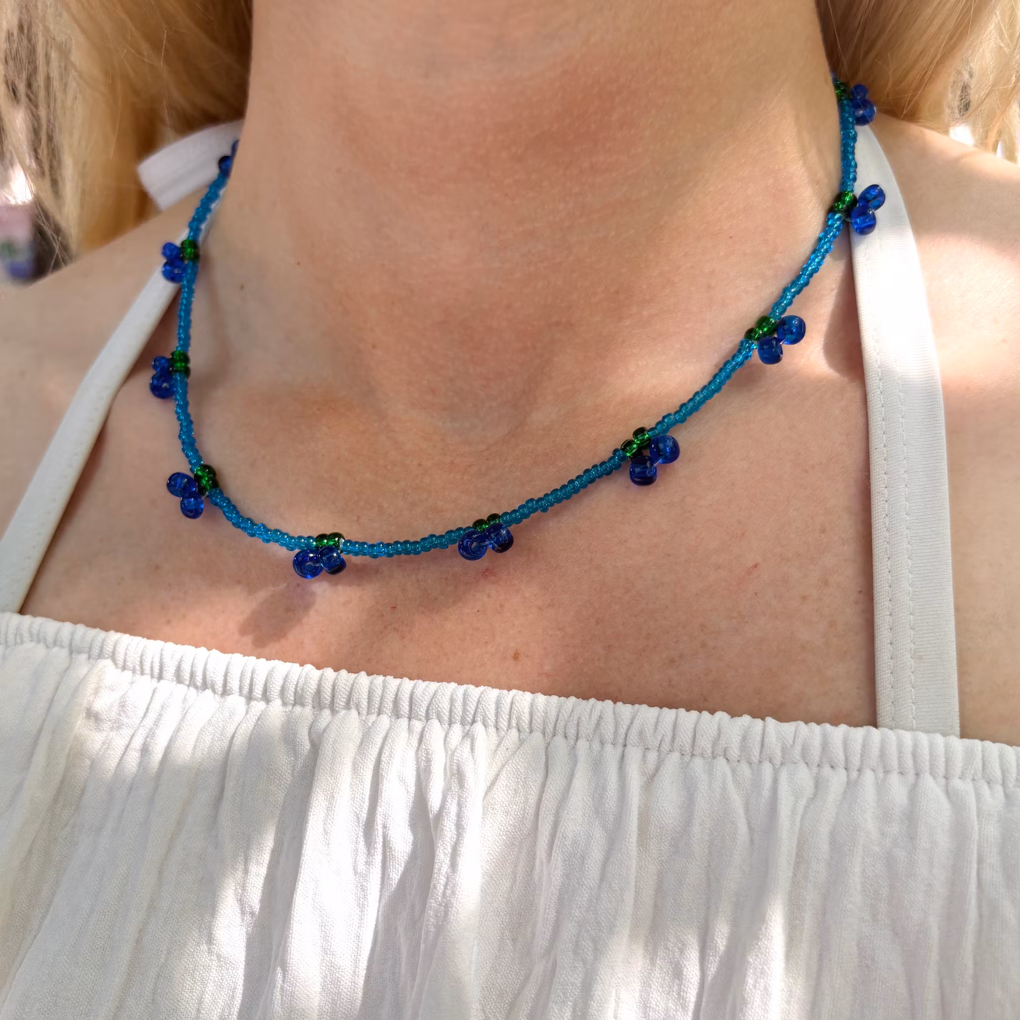 Halsband med lite större blåbär! Välj mellan glaspärlor i ljusrosa, klar, metallisk rosa, blå eller silver