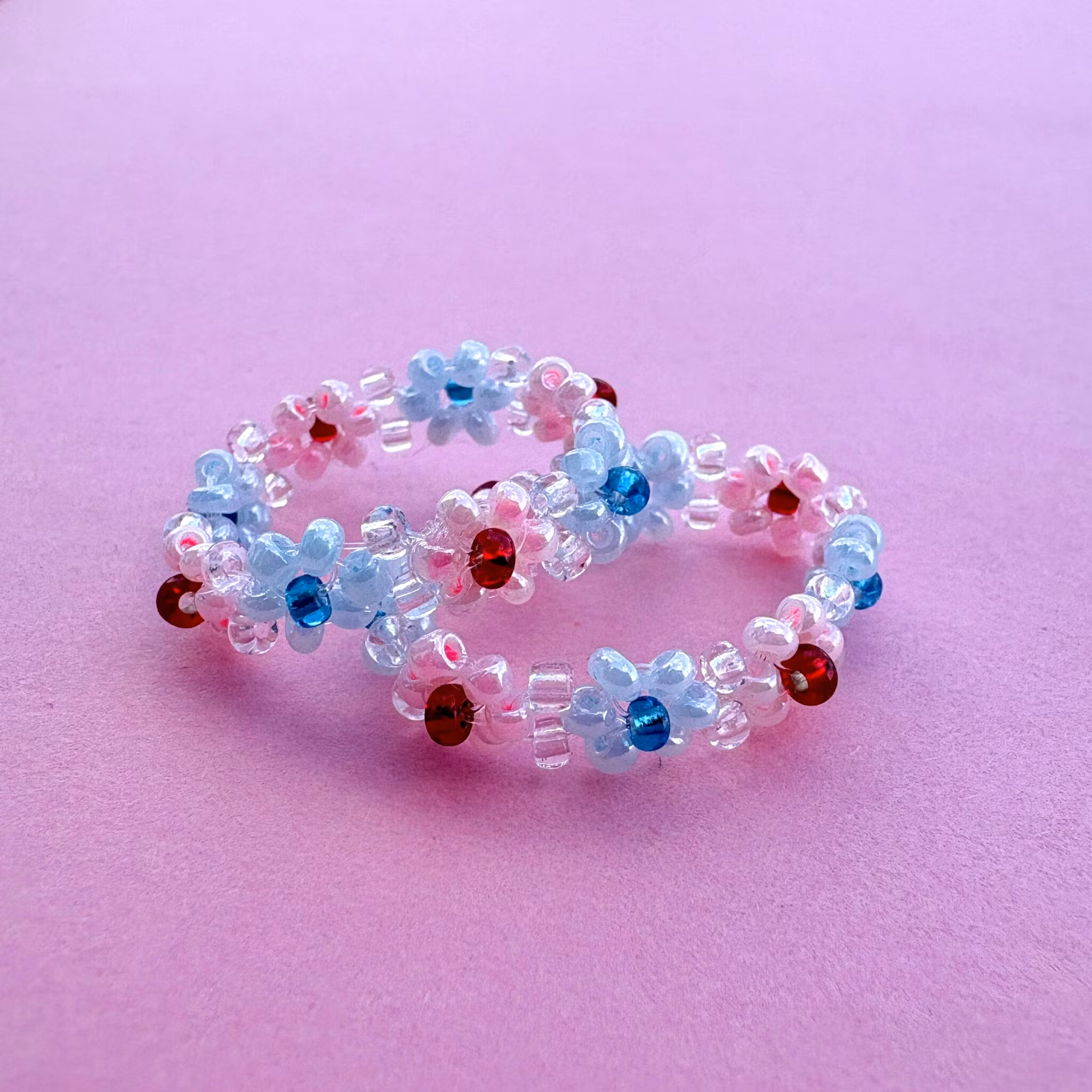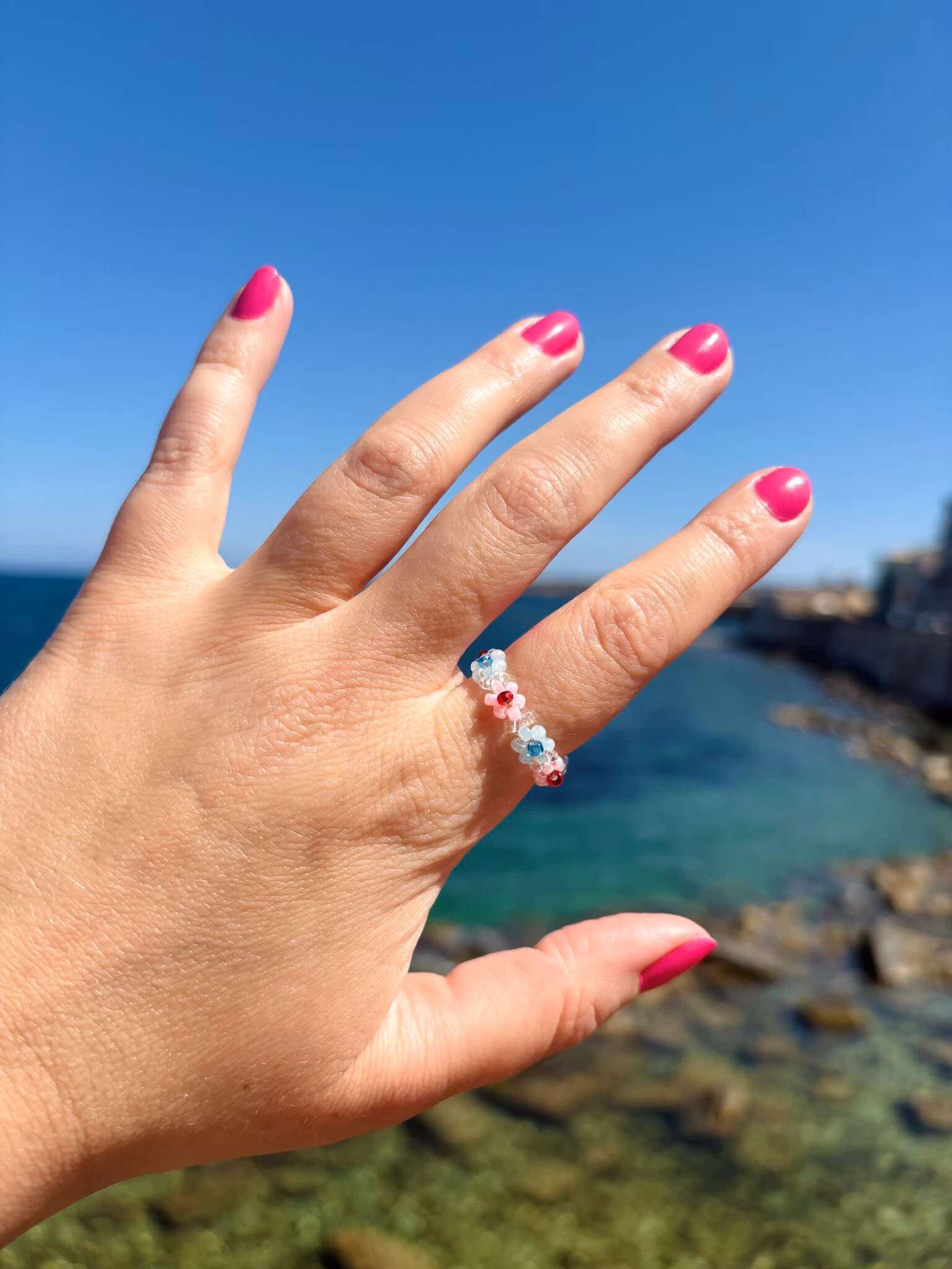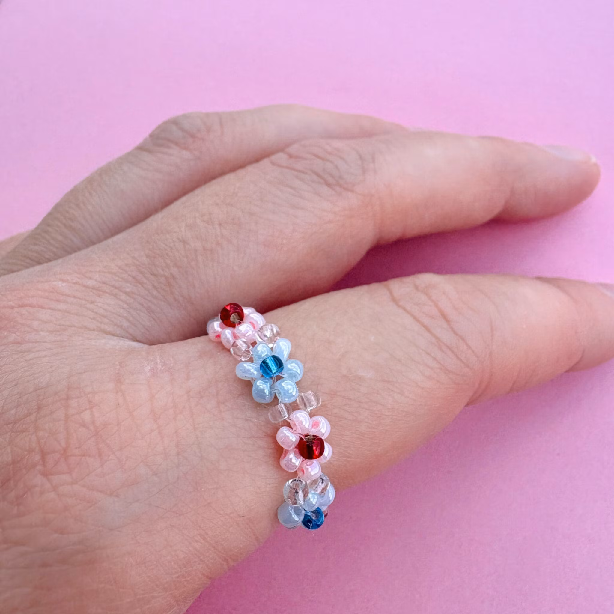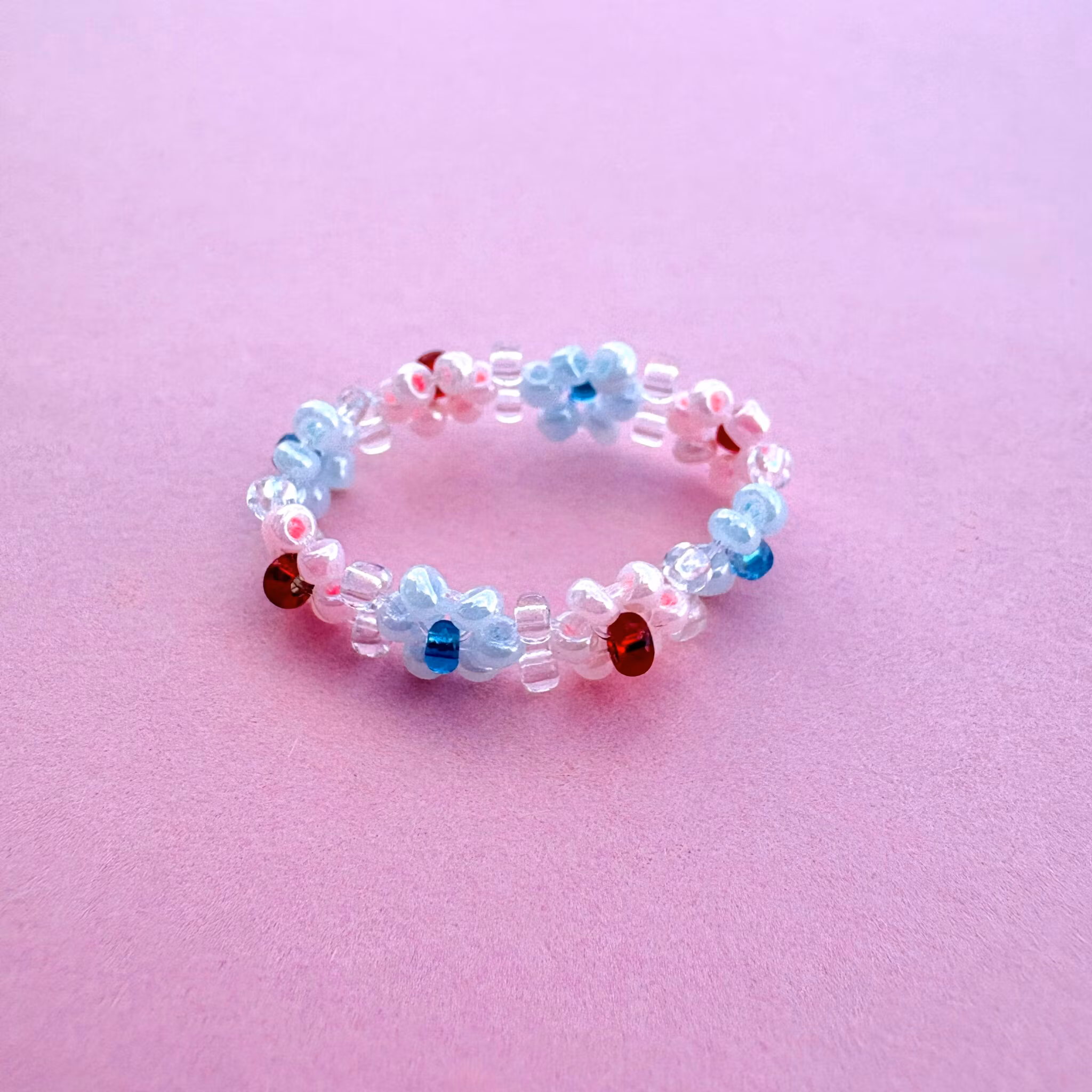 Storlek: 8 Blommor: Fingeromkrets ca 6,5-7 cm. Storlekarna kan variera lite på grund av storleksskillnanden på pärlorna. Ringen kan även töja sig något med tiden. Den här designen kan bara göras med jämt antal blommor, om du önskar en mindre ring med 7 blommor, välj en design med samma färg på alla blommor. OBS! Priset gäller 1 ring